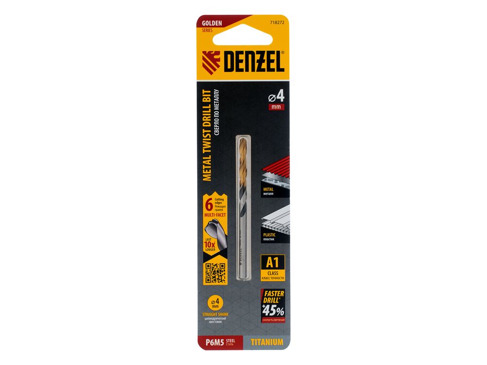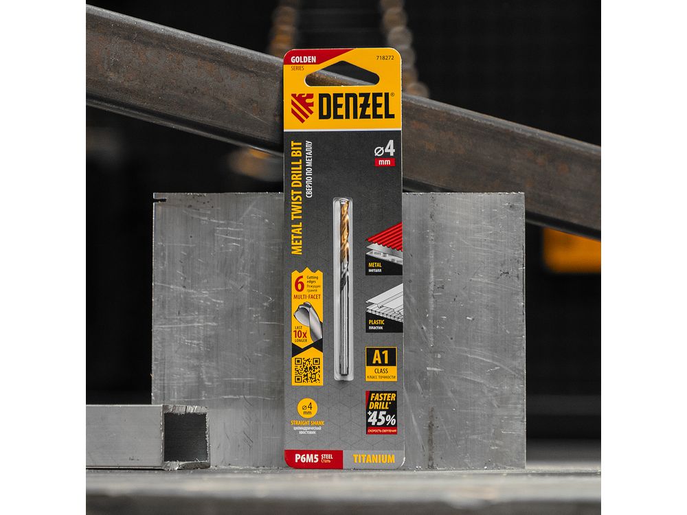 Спиральное сверло по металлу Denzel Golden Tip 718272 из стали P6M5, размером 4 х 75 мм, с многогранной заточкой, предназначено для получения отверстий в легированных сталях и цветных металлах. Многогранная заточка позволяет получать чистые и ровные отверстия практически без заусенцев. Сверлу присвоен класс точности A, что гарантирует высокое качество работ. Оснастка подходит для бытового и профессионального применения.