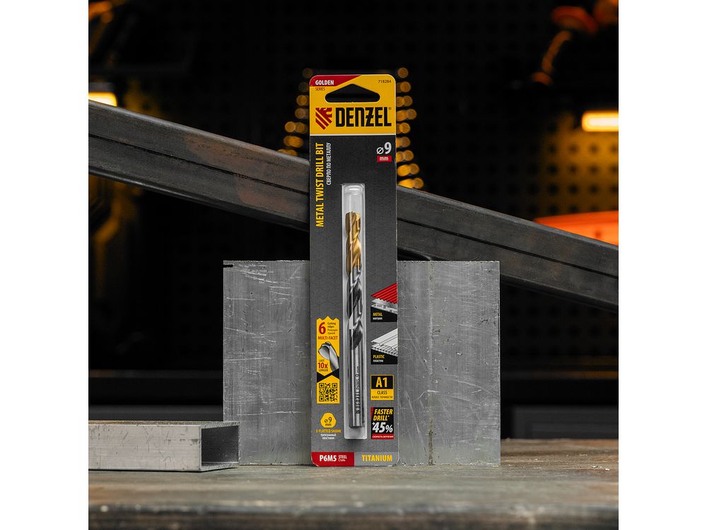 Спиральное сверло по металлу Denzel Golden Tip 718284 из стали P6M5, размером 9 х 125 мм, с многогранной заточкой, предназначено для получения отверстий в легированных сталях и цветных металлах. Многогранная заточка позволяет получать чистые и ровные отверстия практически без заусенцев. Сверлу присвоен класс точности A, что гарантирует высокое качество работ. Оснастка подходит для бытового и профессионального применения.