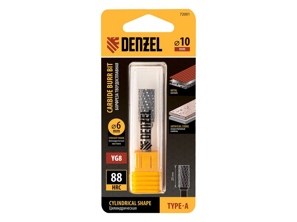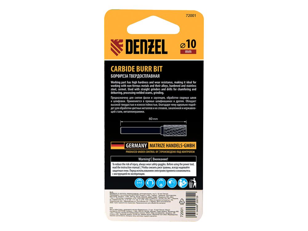 Твердосплавная борфреза Denzel 72001 с цилиндрической рабочей частью (тип A), диаметром 10 мм, используется для работ по металлу (закаленной и нержавеющей стали, латуни, меди, бронзе, чугуну, титану). Подходит также для обработки искусственного камня и металлокерамики. Предназначена для завершающей обработки и подгонки форм и поверхностей: шлифовки, зачистки сварных швов, удаления заусенцев, снятия фасок, разделки кромок. Оснастка устанавливается на прямошлифовальную машину или дрель.