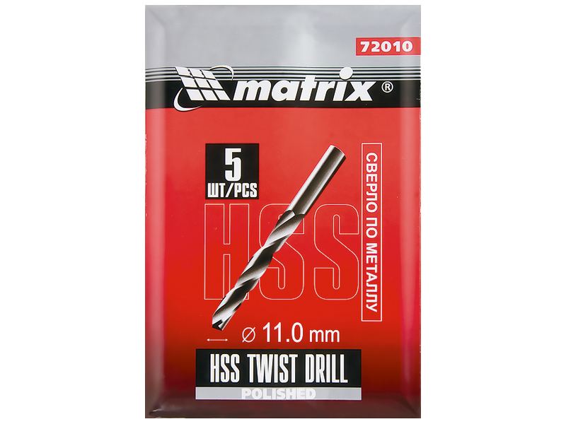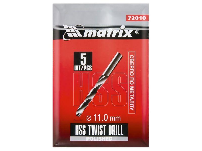 Полированное сверло по металлу Matrix 72010 из стали HSS, с цилиндрическим хвостовиком, 5 шт. в упаковке, используется для получения отверстий диаметром 11 мм. Угол заточки составляет 118 градусов, поэтому сверло оптимально для работы с черными металлами, сталью, чугуном и твердой бронзой.