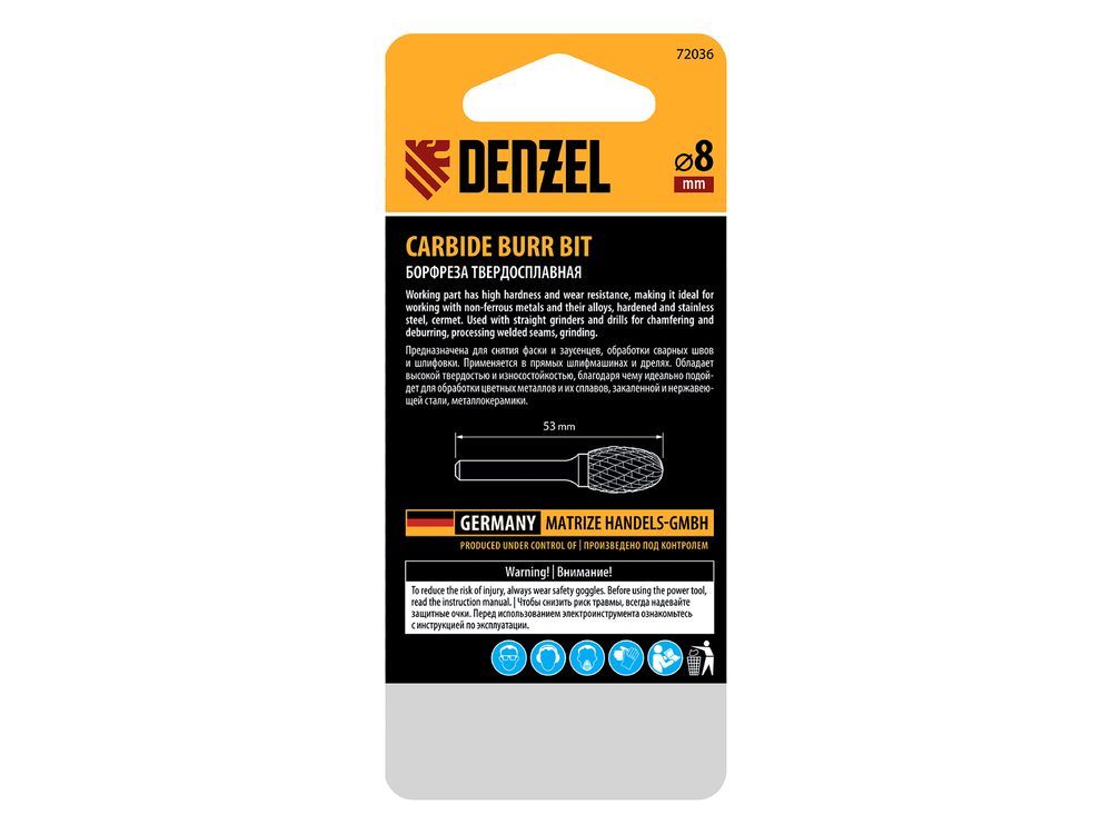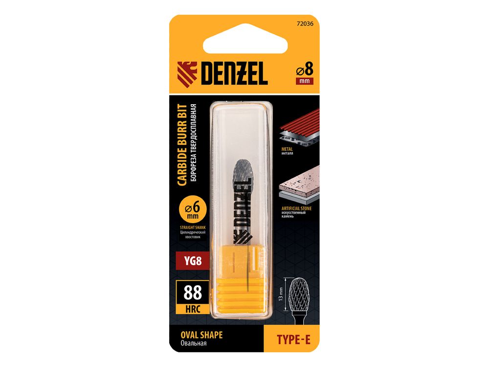 Твердосплавная борфреза по металлу Denzel 72036 с овальной режущей частью (тип E), диаметром 8 мм, предназначена для шлифовки стальных, бронзовых, медных, латунных, чугунных, титановых поверхностей. Также эффективна для обработки искусственного камня и металлокерамики. Овальная рабочая часть позволяет зачищать сварные швы, удалять заусенцы, снимать фаски, обрабатывать закругленные углы. С помощью борфрезы можно восстановить утратившую первоначальный вид гравировку. Режущая оснастка устанавливается на дрель или прямошлифовальную машину.