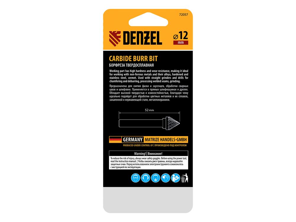 Твердосплавная борфреза по металлу Denzel 72057 с рабочей частью-зенкером с вершиной 60° (тип J), диаметром 12 мм, устанавливается на дрель или прямошлифовальную машину. Используется для обработки закаленной и нержавеющей стали, латуни, бронзы, меди, чугуна, титана, а также металлокерамики и искусственного камня. Оптимальна для снятия фасок и заусенцев, обработки кромок, угловых пазов, краев отверстий.