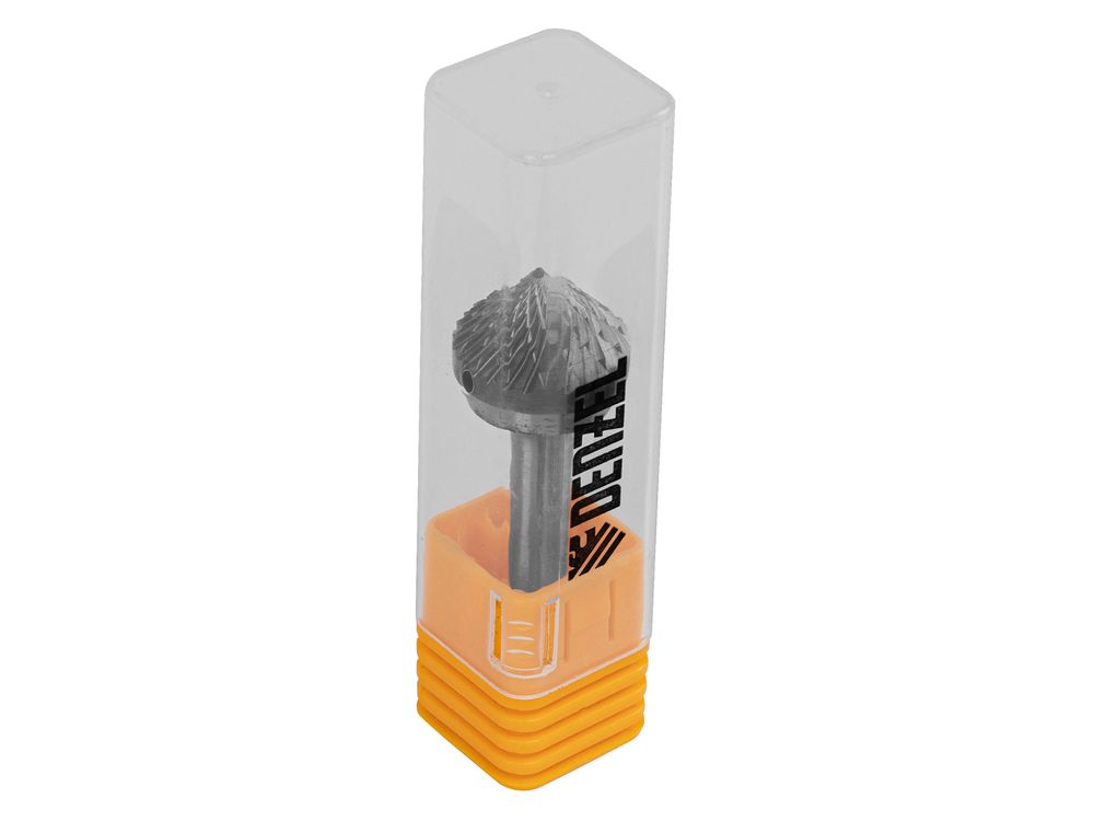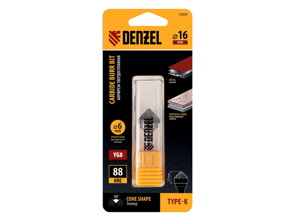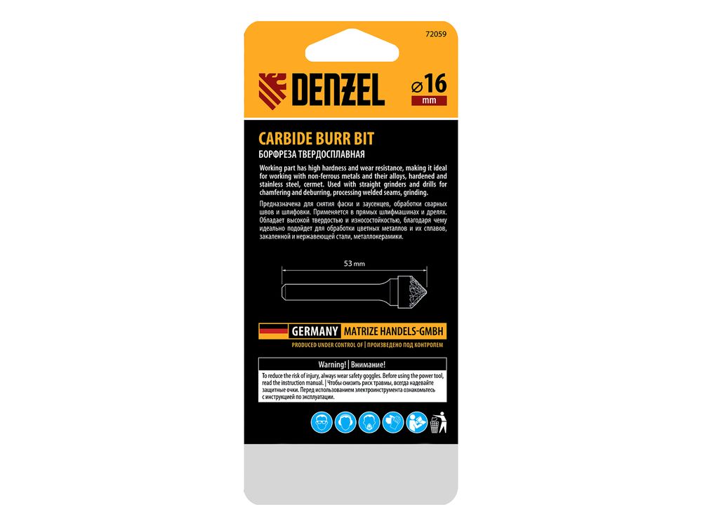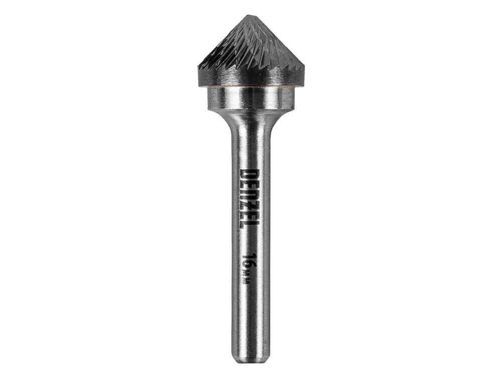Твердосплавная борфреза по металлу Denzel 72059 с рабочей частью-зенкером с вершиной 90° (тип K), диаметром 16 мм, устанавливается на дрель или прямошлифовальную машину. Используется для обработки закаленной и нержавеющей стали, латуни, бронзы, меди, чугуна, титана, а также металлокерамики и искусственного камня. Оптимальна для снятия фасок и заусенцев, обработки кромок, угловых пазов, краев отверстий.