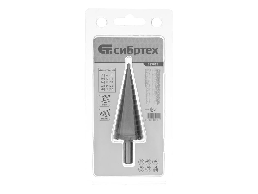 Ступенчатое сверло Сибртех 723015 предназначено для сверления отверстий диаметром от 4 до 32 мм в сталях, цветных металлах и пластике. Избавляет от необходимости иметь при себе целый набор традиционных сверл. Позволяет получать отверстия с ровными краями и уже снятой фаской под гайку или болт. Сверло пригодится дома и в мастерской.