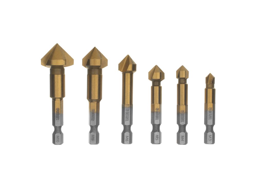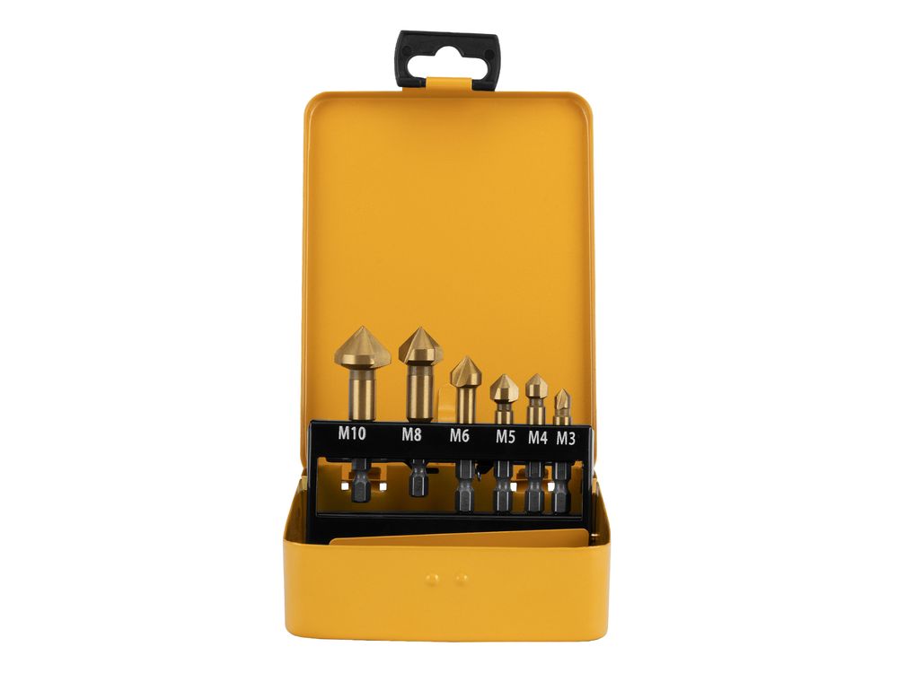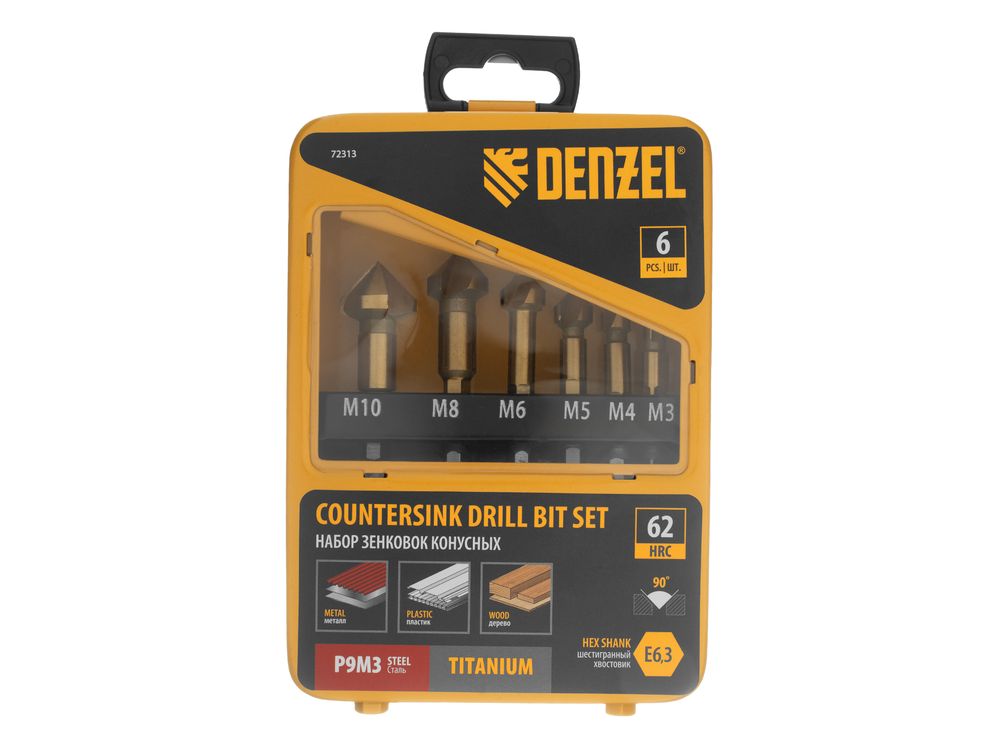 Набор зенковок Denzel 72313 размером M3-M10 применяется при работе с электрическими дрелями и сверлильными станками. Зенковки используются для выполнения конических отверстий и снятия фасок в стали, цветных металлах, пластике и древесине. В комплекте 6 зенковок с шестигранными хвостовиками.