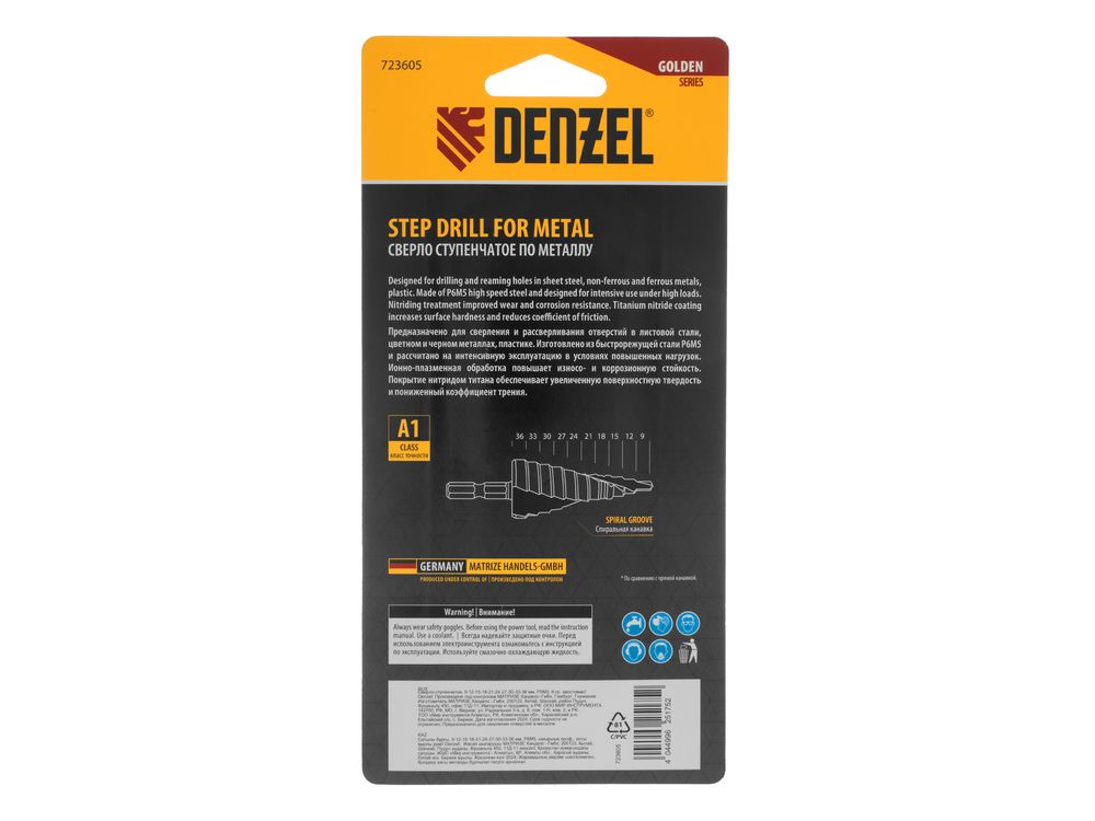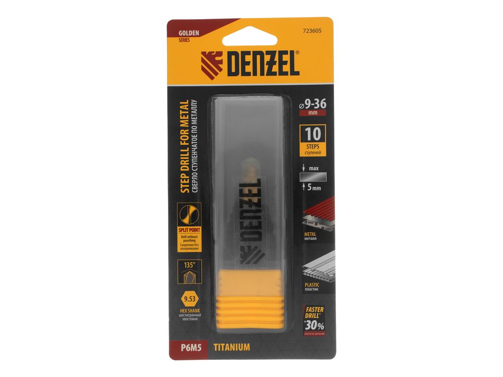 Ступенчатое сверло Denzel 723605 из стали P6M5, с 6-гранным хвостовиком, предназначено для сверления отверстий диаметром от 9 до 36 мм в сталях, цветных металлах и пластике. Избавляет от необходимости иметь при себе целый набор традиционных сверл. Позволяет получать отверстия с ровными краями и уже снятой фаской под гайку или болт. Оснастке присвоен класс точности A1. Сверло пригодится дома и в мастерской.