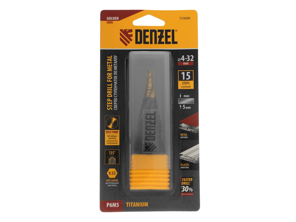 Ступенчатое сверло Denzel 723606 из стали P6M5, с 6-гранным хвостовиком, предназначено для сверления отверстий диаметром от 4 до 32 мм в сталях, цветных металлах и пластике. Избавляет от необходимости иметь при себе целый набор традиционных сверл. Позволяет получать отверстия с ровными краями и уже снятой фаской под гайку или болт. Оснастке присвоен класс точности A1. Сверло пригодится дома и в мастерской.