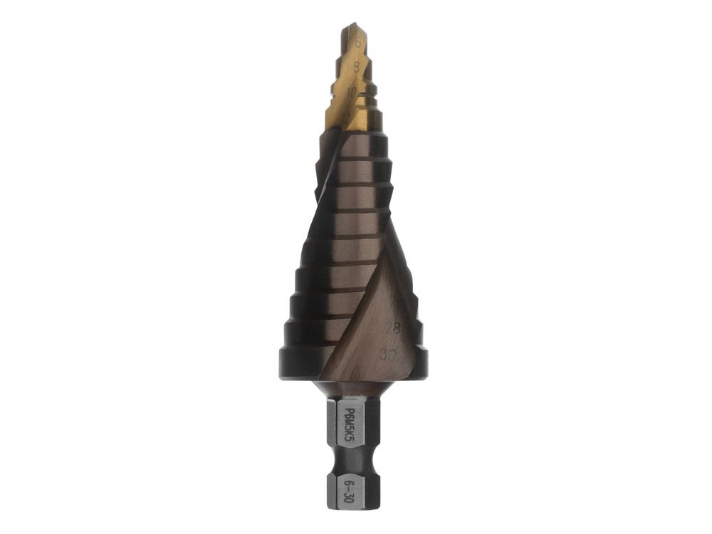 Ступенчатое сверло Denzel 723614 из стали P6M5K5, с 6-гранным хвостовиком, предназначено для сверления отверстий диаметром от 6 до 30 мм в сталях, цветных металлах и пластике. Избавляет от необходимости иметь при себе целый набор традиционных сверл. Позволяет получать отверстия с ровными краями и уже снятой фаской под гайку или болт. Оснастке присвоен класс точности A1. Сверло пригодится дома и в мастерской.