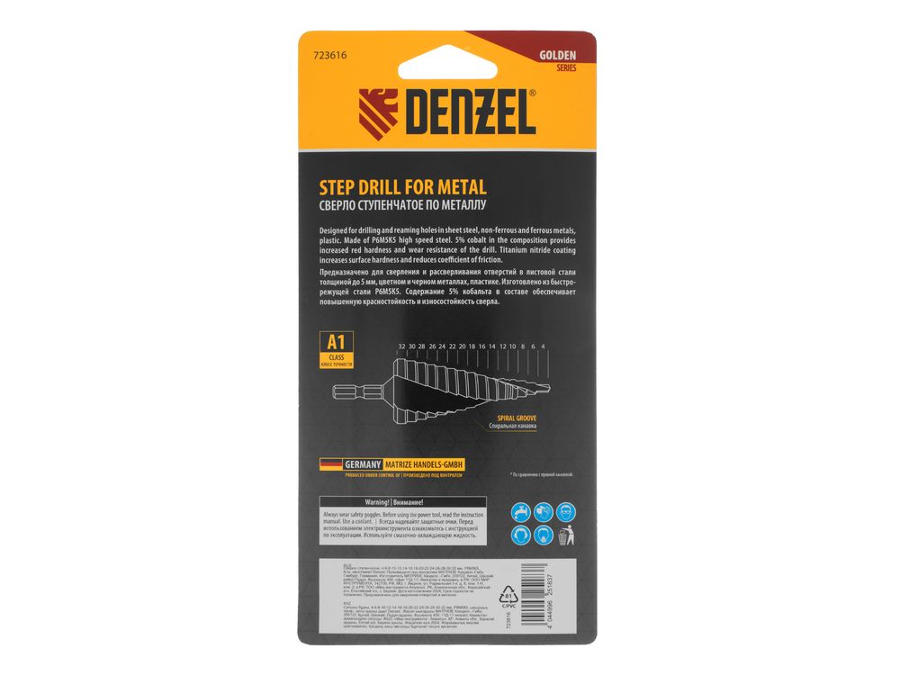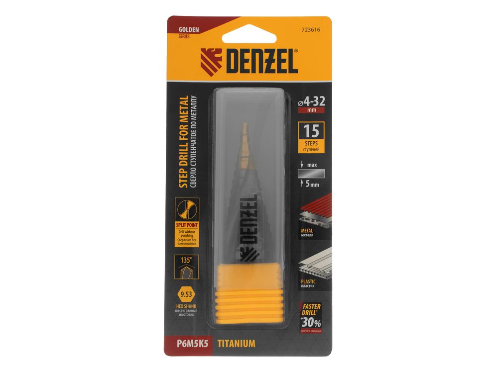 Ступенчатое сверло Denzel 723616 из стали P6M5K5, с 6-гранным хвостовиком, предназначено для сверления отверстий диаметром от 4 до 32 мм в сталях, цветных металлах и пластике. Избавляет от необходимости иметь при себе целый набор традиционных сверл. Позволяет получать отверстия с ровными краями и уже снятой фаской под гайку или болт. Оснастке присвоен класс точности A1. Сверло пригодится дома и в мастерской.