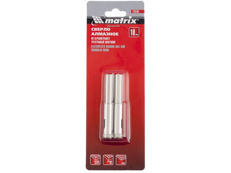 Универсальное алмазное сверло по керамограниту Matrix 726063 размером 6 х 67 мм, с 3-гранным хвостовиком, 2 шт. в упаковке, применяется для получения отверстий в стекле, плитке, кафеле. За счет высокой концентрации алмазов в режущем слое оно легко справляется со сверлением керамогранита. Сверло рассчитано на профессиональное использование с дрелями и шуруповертами, рекомендованная скорость составляет 350-700 об/мин. Водяное охлаждение в процессе работы значительно повышает срок службы оснастки.