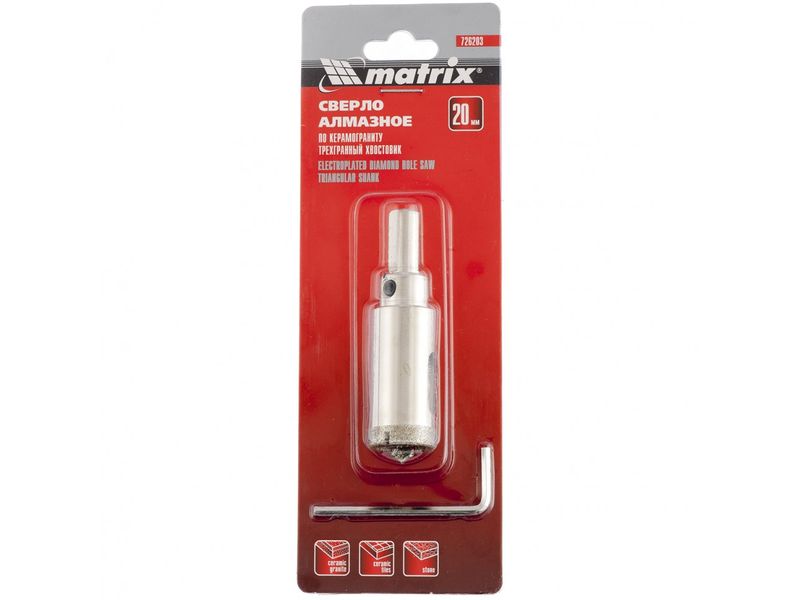 Универсальное алмазное сверло по керамограниту Matrix 726143 размером 14 х 67 мм, с 3-гранным хвостовиком, применяется для получения отверстий в стекле, плитке, кафеле. За счет высокой концентрации алмазов в режущем слое оно легко справляется со сверлением керамогранита. Сверло рассчитано на профессиональное использование с дрелями и шуруповертами, рекомендованная скорость составляет 350-700 об/мин. Водяное охлаждение в процессе работы значительно повышает срок службы оснастки.