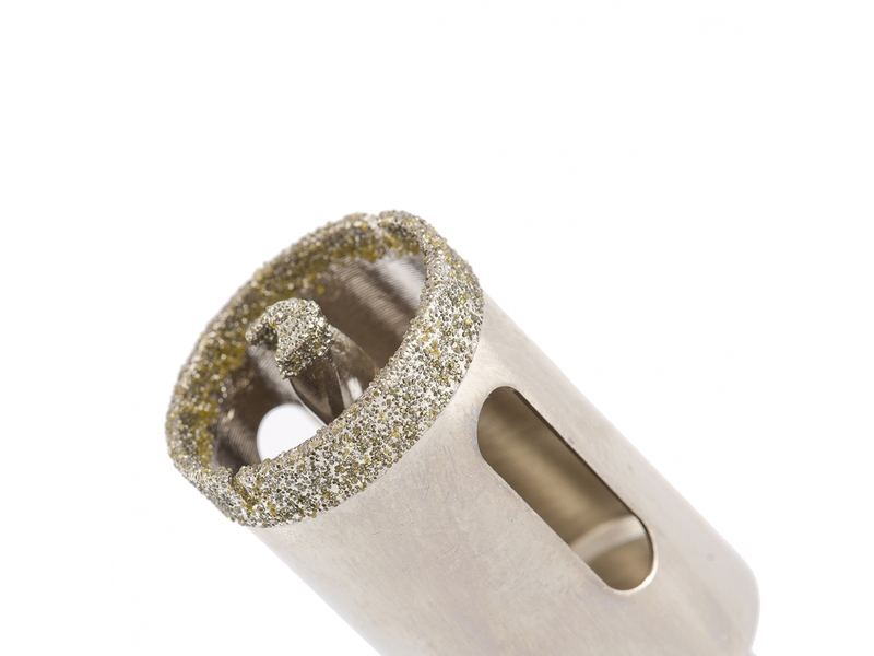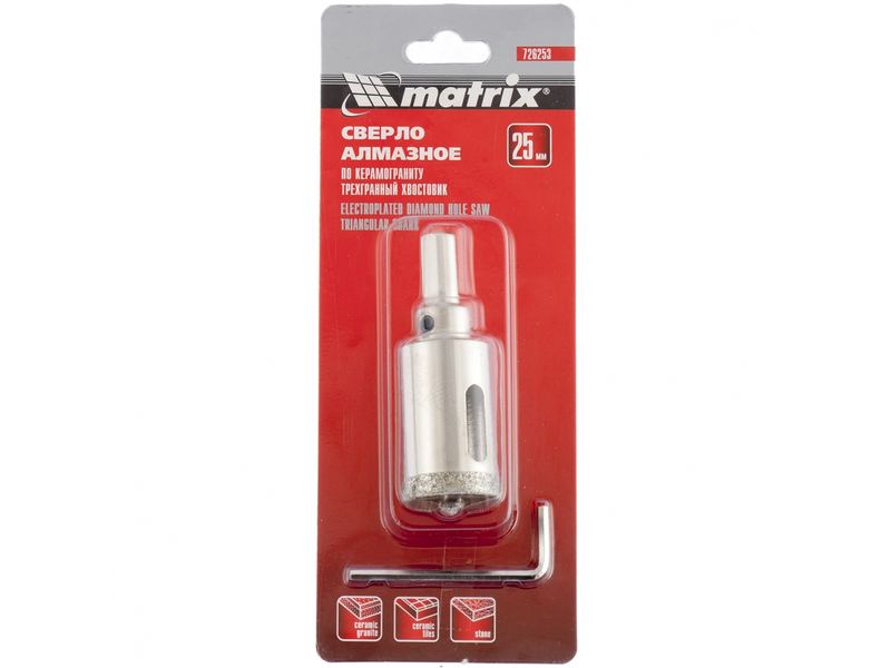 Универсальное алмазное сверло по керамограниту Matrix 726283 размером 28 х 67 мм, с 3-гранным хвостовиком, применяется для получения отверстий в стекле, плитке, кафеле. За счет высокой концентрации алмазов в режущем слое оно легко справляется со сверлением керамогранита. Сверло рассчитано на профессиональное использование с дрелями и шуруповертами. Водяное охлаждение в процессе работы значительно повышает срок службы оснастки.