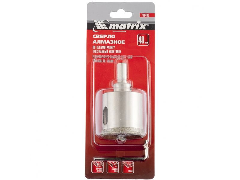 Универсальное алмазное сверло по керамограниту Matrix 726403 размером 40 х 67 мм, с 3-гранным хвостовиком, применяется для получения отверстий в стекле, плитке, кафеле. За счет высокой концентрации алмазов в режущем слое оно легко справляется со сверлением керамогранита. Сверло рассчитано на профессиональное использование с дрелями и шуруповертами. Водяное охлаждение в процессе работы значительно повышает срок службы оснастки.
