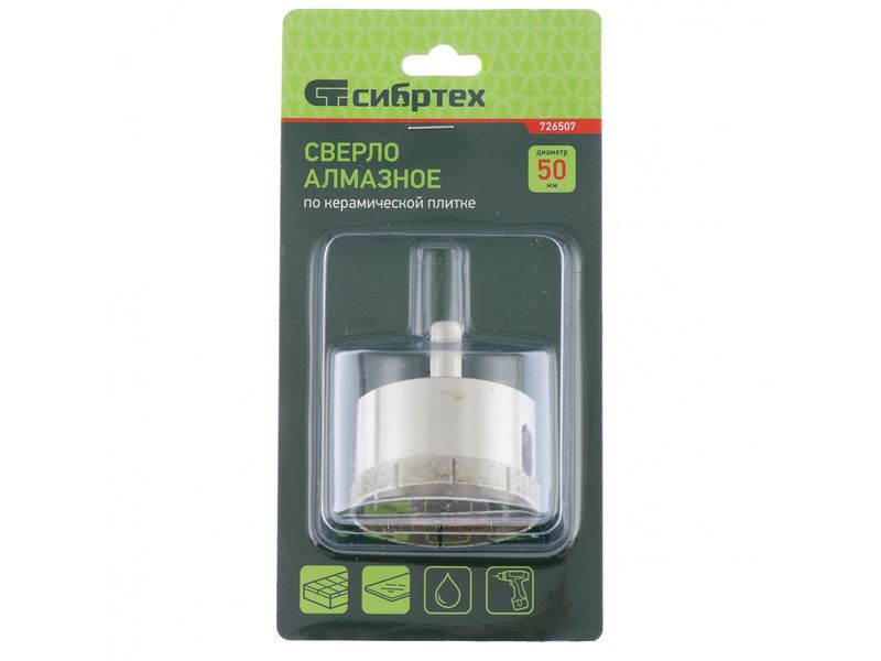 Сверло Сибртех 726607 размером 60 х 55 мм, с цилиндрическим хвостовиком, используется для получения ровных отверстий без сколов в стекле и керамической плитке. Устанавливается в патрон дрели или шуруповерта, работающих в диапазоне 350-700 об/мин. Во время работы рекомендуется применять водяное охлаждение — это существенно увеличит ресурс оснастки. Использование кондуктора (арт. 72830) позволяет точно позиционировать сверло и облегчает засверливание. Оснастка подходит для выполнения работ небольшого объема и рекомендована для использования в быту.