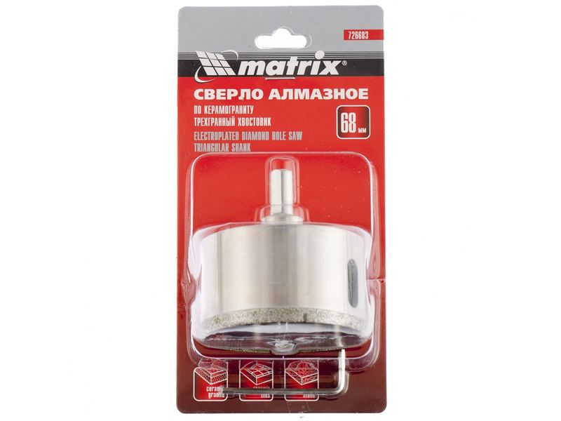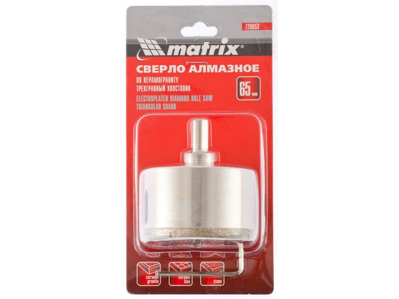 Универсальное алмазное сверло по керамограниту Matrix 726653 размером 65 х 67 мм, с 3-гранным хвостовиком, применяется для получения отверстий в стекле, плитке, кафеле. За счет высокой концентрации алмазов в режущем слое оно легко справляется со сверлением керамогранита. Сверло рассчитано на профессиональное использование с дрелями и шуруповертами. Водяное охлаждение в процессе работы значительно повышает срок службы оснастки.
