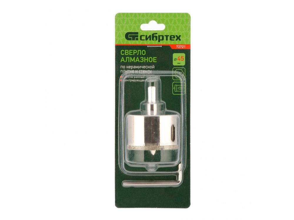 Сверло Сибртех 72721 размером 45 х 55 м, с шестигранным хвостовиком и центрирующим сверлом, позволяет получать отверстия в керамической плитке и стекле. Его устанавливают на дрель или шуруповерт, рекомендуемый диапазон рабочих оборотов 350-700 об/мин. Оснастка используется при выполнении бытовых ремонтных и отделочных работ.