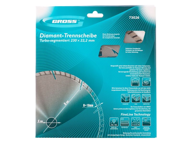 Алмазный турбо-сегментный диск Gross 73026 диаметром 230 х 22,2 мм, для сухой резки, — оснастка для УШМ со скоростью вращения до 6650 об/мин, предназначенная для отрезных работ. Универсальный диск с турбированной рабочей частью можно использовать для резки камня, гранита и кирпича, свежего бетона, а также слабоармированного железобетона. Он подходит для профессионального использования.