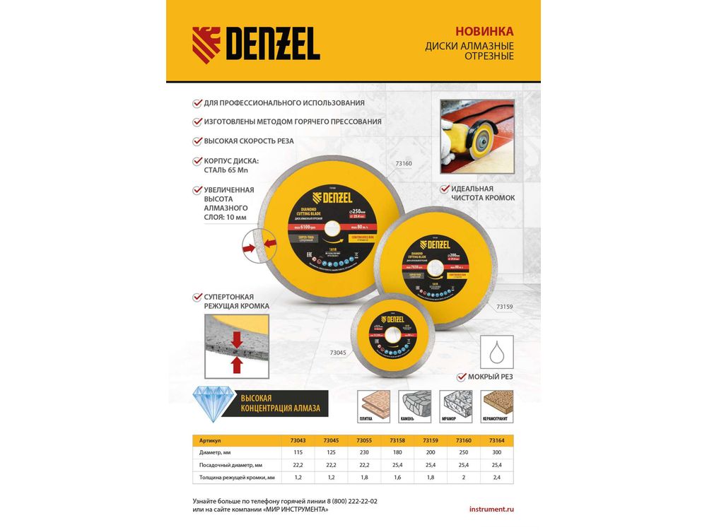 Алмазный диск ТМ Denzel Сплошной арт 73055, ф230 х 22,2 мм, предназначен для мокрого резания мрамора, керамогранита и керамическую плитки, камня. Устанавливается на УШМ (болгарку) или плиткорез с посадочным диаметром 22,2 мм. Высокая концентрация алмазов и супертонкая рабочая часть диска обеспечивает идеальную частоту кромок и высокую скорость реза.Диск произведен по технологии горячего прессования с увеличенной шириной режущей кромки (10мм) подходит для профессионального использования и больших объемов работ.