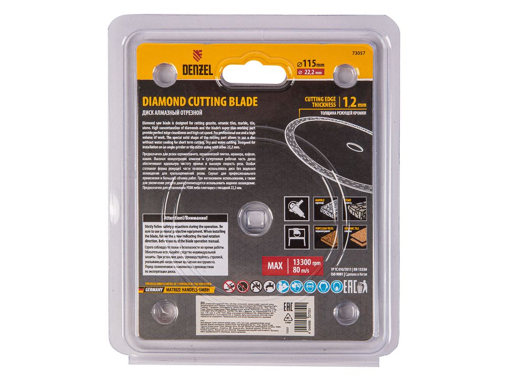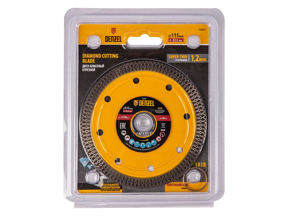 Сплошной отрезной алмазный диск Denzel 73057 диаметром 115 x 22,2 мм, супертонкий, изготовлен по технологии горячего прессования и предназначен для сухого и мокрого реза керамогранита, керамической плитки, мрамора, кафеля, камня. Устанавливается на углошлифовальную машину или плиткорез с соответствующим посадочным диаметром, подходит для выполнения большого объема работ.