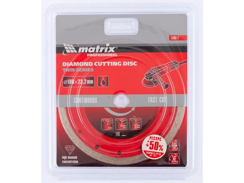Отрезной сплошной алмазный диск Matrix ф180х22,2 мм 730817, тонкий, обеспечивает мокрое резание плотных материалов: керамогранита, керамической и кафельной плитки, мрамора, натурального и искусственного камня. Он устанавливается на УШМ или плиткорезы и используется с применением водяного охлаждения. Диск увеличивает производительность на 20% благодаря небольшой толщине 2 мм и снижению нагрузки на инструмент.