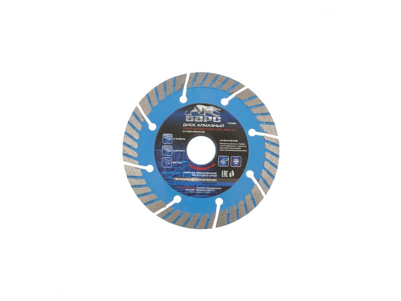 Турбо-сегментный алмазный диск Барс ф125х22,2 мм 73086 позволяет проводить сухое резание твердых материалов: камня, песчаника, кирпича, гранита, бетона, в т.ч. свежего и среднеармированного. Применяется в качестве расходного материала с УШМ. За счет турбо-сегментной конструкции диск быстро справляется с поставленными задачами и не требует водяного охлаждения.