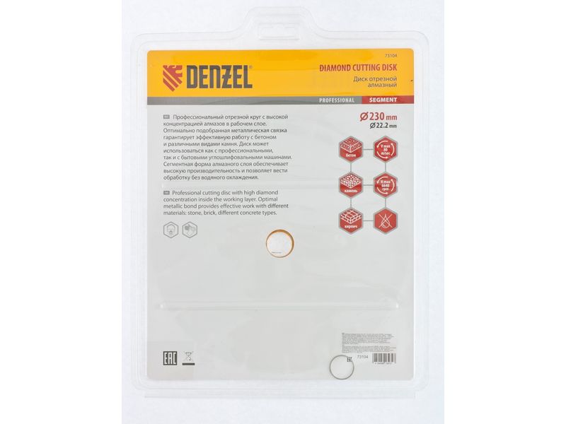 Отрезной сегментный алмазный диск Denzel 73104 диаметром 230 х 22,2 мм — оснастка для УШМ, использующаяся для сухой резки свежего и старого бетона, камня, кирпича, шлакоблока, мрамора, тротуарной плитки, гранита. Диск сегментного типа отличается высокой производительностью даже при интенсивных нагрузках. Подходит для бытового и профессионального использования.