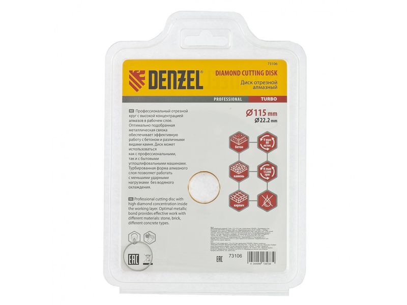 Отрезной алмазный диск Denzel Turbo 73106 диаметром 115 х 22,2 мм используется для сухой резки камня, кирпича, свежего и затвердевшего бетона, железобетона. Благодаря специальной форме испытывает уменьшенную нагрузку при резании материалов. Устанавливается на УШМ и применяется для проведения бытовых и профессиональных отрезных работ.