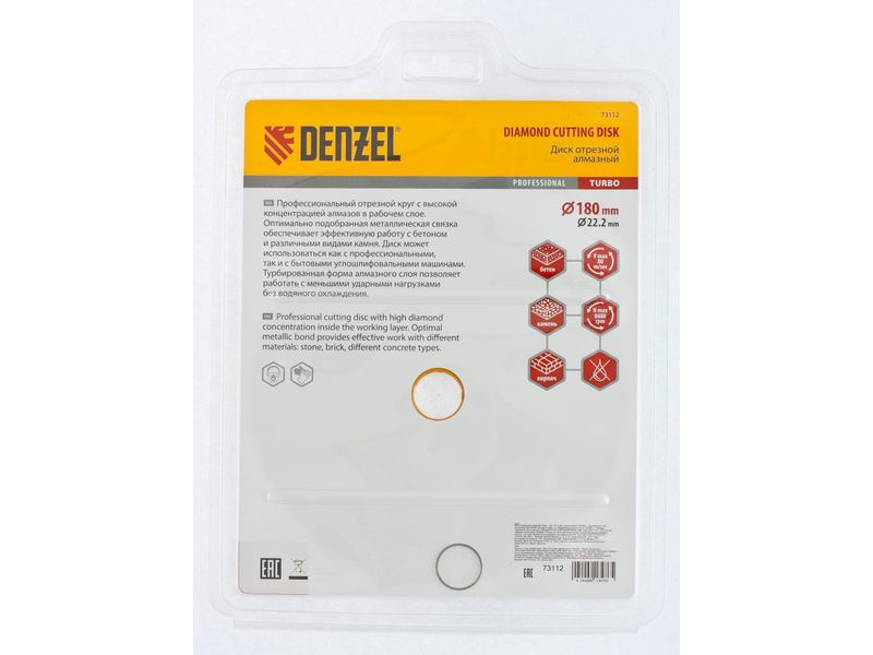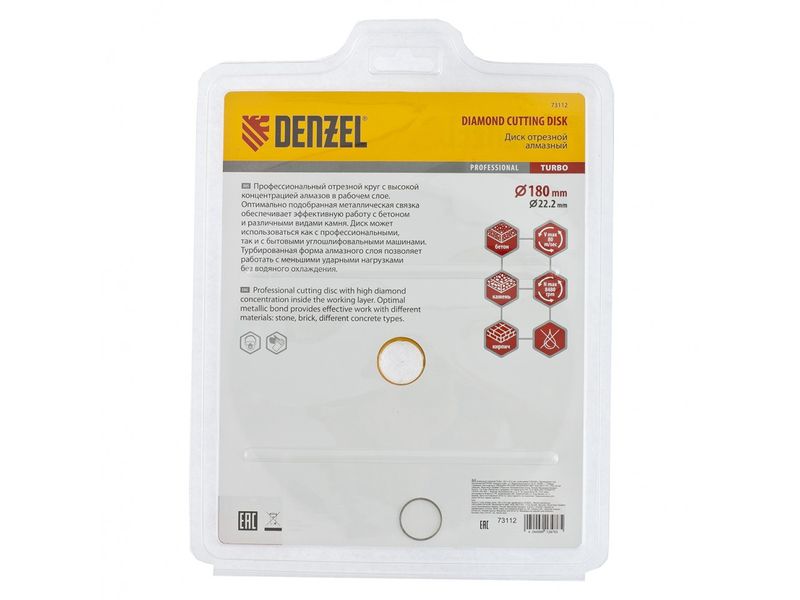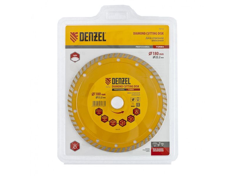 Отрезной алмазный диск Denzel Turbo 73112 диаметром 180 х 22,2 мм используется для сухой резки камня, кирпича, свежего и затвердевшего бетона, железобетона. Благодаря специальной форме испытывает уменьшенную нагрузку при резании материалов. Устанавливается на УШМ и применяется для проведения бытовых и профессиональных отрезных работ.