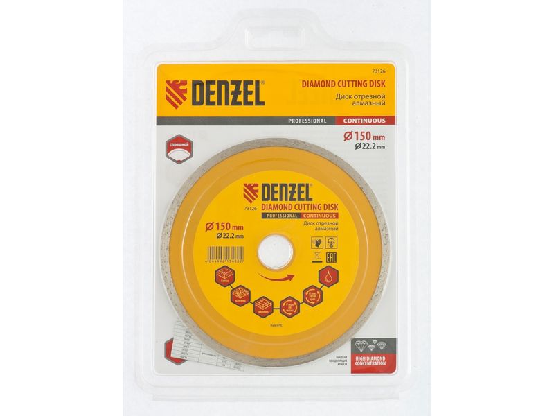 Отрезной алмазный диск Denzel «Сплошной» 73126 диаметром 150 х 22,2 мм используется для «мокрого» резания совместно с углошлифовальной машиной или плиткорезом с соответствующим посадочным диаметром. Режет камень, мрамор, керамогранитную и керамическую плитку. Диск отличается хорошей производительностью за счет высокой скорости реза, поэтому подходит для профессионального применения.