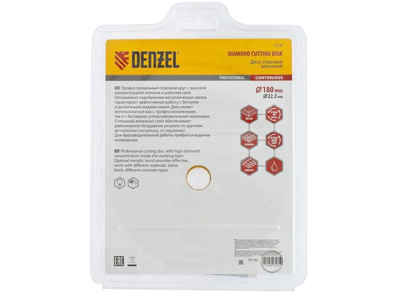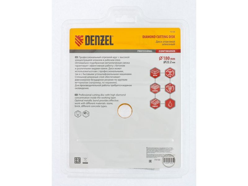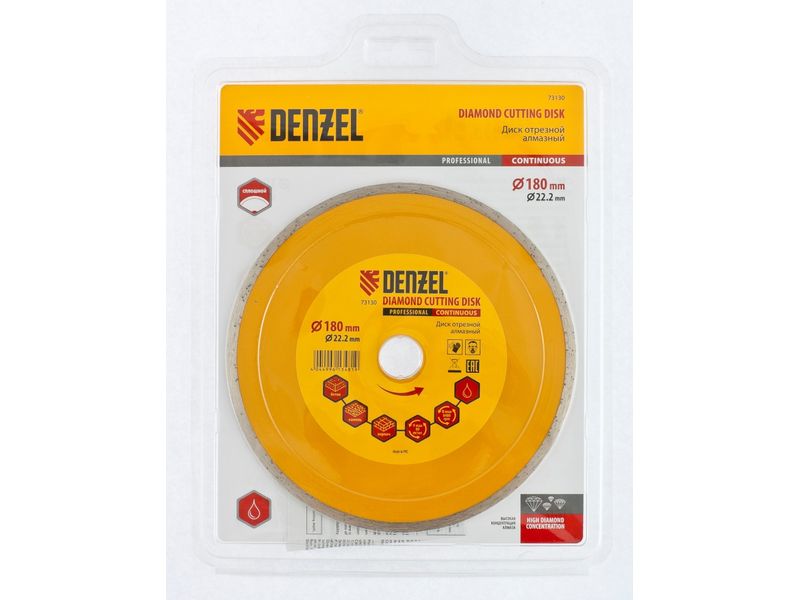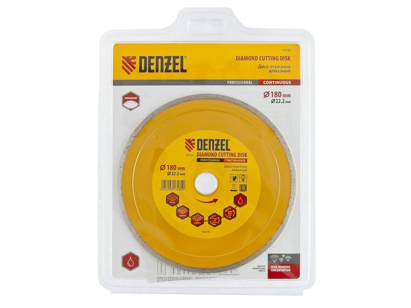 Отрезной алмазный диск Denzel «Сплошной» 73130 диаметром 180 х 22,2 мм используется для «мокрого» резания совместно с углошлифовальной машиной или плиткорезом с соответствующим посадочным диаметром. Режет камень, мрамор, керамогранитную и керамическую плитку. Диск отличается хорошей производительностью за счет высокой скорости реза, поэтому подходит для профессионального применения.