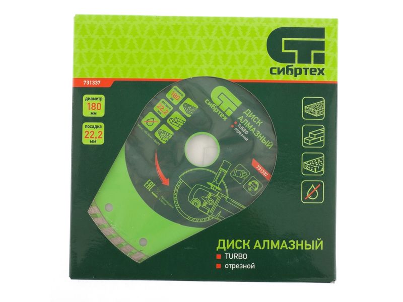 Алмазный отрезной диск Сибртех Turbo 731337 для сухой резки, диаметром 180 х 22,2 мм, устанавливается на углошлифовальную машину. Позволяет резать твердые материалы: бетон, железобетон, камень, песчаник. Диск предназначен для бытового использования.