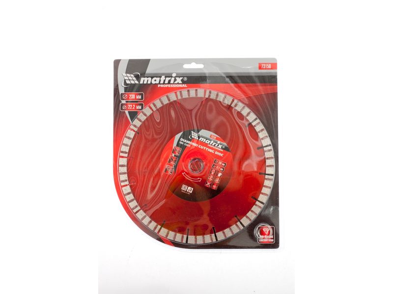 Турбо-сегментный отрезной алмазный диск Matrix 73150 диаметром 230 х 22,2 мм предназначен для сухой резки бетона различной прочности, камня, кирпича, тротуарной плитки, шлакоблока. Устанавливается на углошлифовальную машину с посадочным размером 22,2 мм. Благодаря специально подобранной металлической связке диск демонстрирует высокие результаты работы даже при резке слабоармированного железобетона. Оснастка оптимальна для бытового применения.