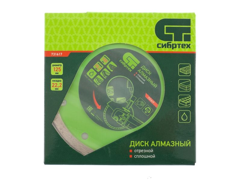 Алмазный отрезной сплошной диск Сибртех 731617 диаметром 125 х 22,2 мм применяется для мокрой резки керамогранитной, керамической плитки, а также мрамора и камня. Используется в качестве оснастки для болгарок и плиткорезов с посадочным диаметром 22,2 мм. Диск обладает хорошим рабочим ресурсом и рассчитан на долгую службу. Рез материалов необходимо проводить с использованием водяного охлаждения.