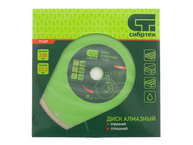 Алмазный отрезной сплошной диск Сибртех 731657 диаметром 230 х 22,2 мм применяется для мокрой резки керамогранитной, керамической плитки, а также мрамора и камня. Используется в качестве оснастки для болгарок и плиткорезов с посадочным диаметром 22,2 мм. Диск обладает хорошим рабочим ресурсом и рассчитан на долгую службу. Рез материалов необходимо проводить с использованием водяного охлаждения.