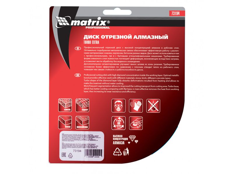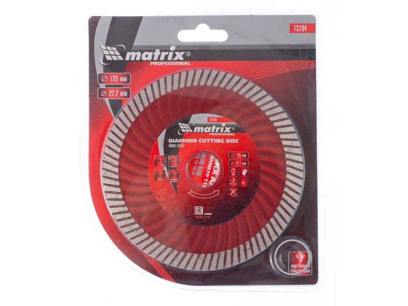 Отрезной алмазный диск Matrix Turbo Extra 73194, 125 х 22,2 мм, используется для сухой резки бетона, железобетона, кирпича, тротуарной плитки, шлакоблока и камня. Он устанавливается на углошлифовальные машины с посадочным диаметром 22,2 мм. Обеспечивает высокую скорость реза, поэтому подходит для интенсивного применения.