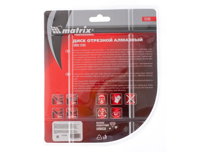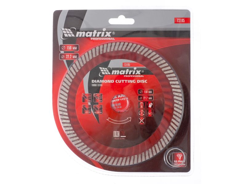 Отрезной алмазный диск Matrix Turbo Extra 73195, 150 х 22,2 мм, используется для сухой резки бетона, железобетона, кирпича, тротуарной плитки, шлакоблока и камня. Он устанавливается на углошлифовальные машины с посадочным диаметром 22,2 мм. Обеспечивает высокую скорость реза, поэтому подходит для интенсивного применения.