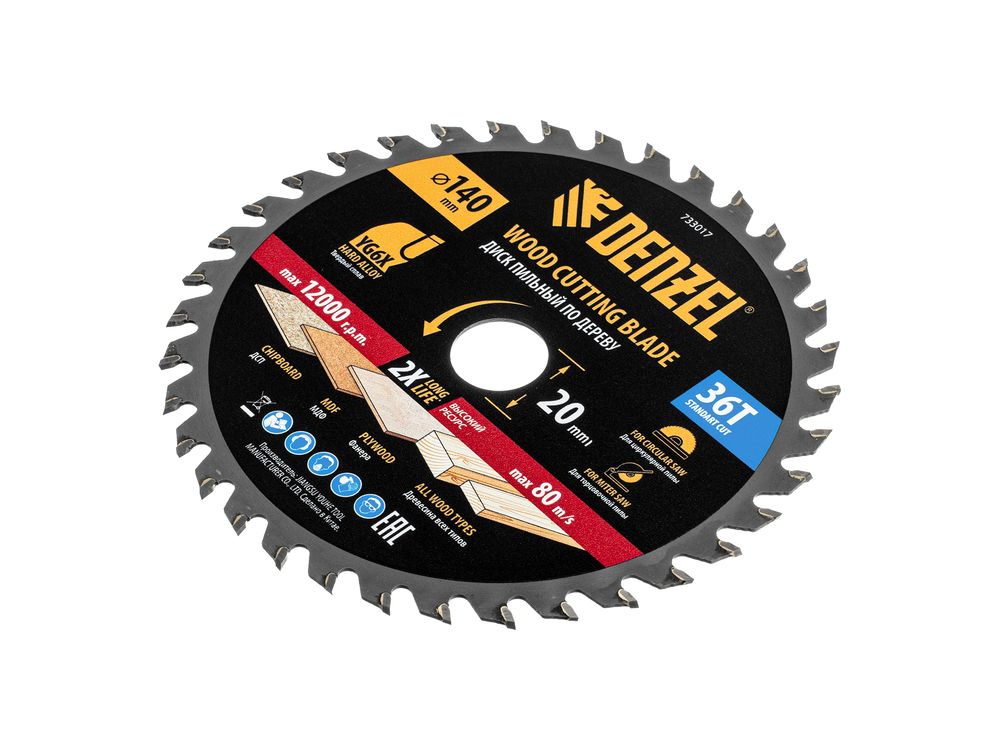 Пильный диск Denzel 733017 диаметром 140 x 20 мм, с 36 зубьями, предназначен для продольного и поперечного распила твердой и мягкой древесины, фанеры, МДФ, ДСП. 36 зубьев типа ATB с режущими пластинами оптимальной геометрии обеспечивают качественный рез. Тип реза — стандартный. Режущие пластины из твердого сплава YG6X сохраняют рабочие свойства при интенсивном использовании. Диск устанавливается на циркулярную, торцовочную пилу или на распиловочный станок. В комплект поставки входит переходное кольцо с 20 на 16 мм, что позволяет изменить посадочный размер и расширяет возможности использования диска.