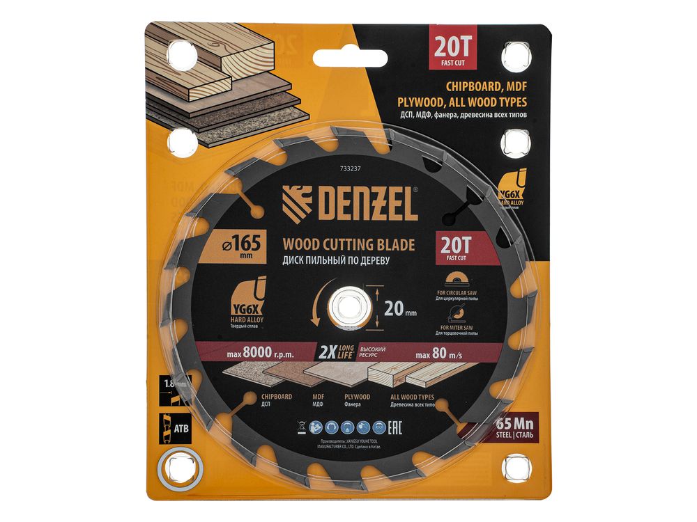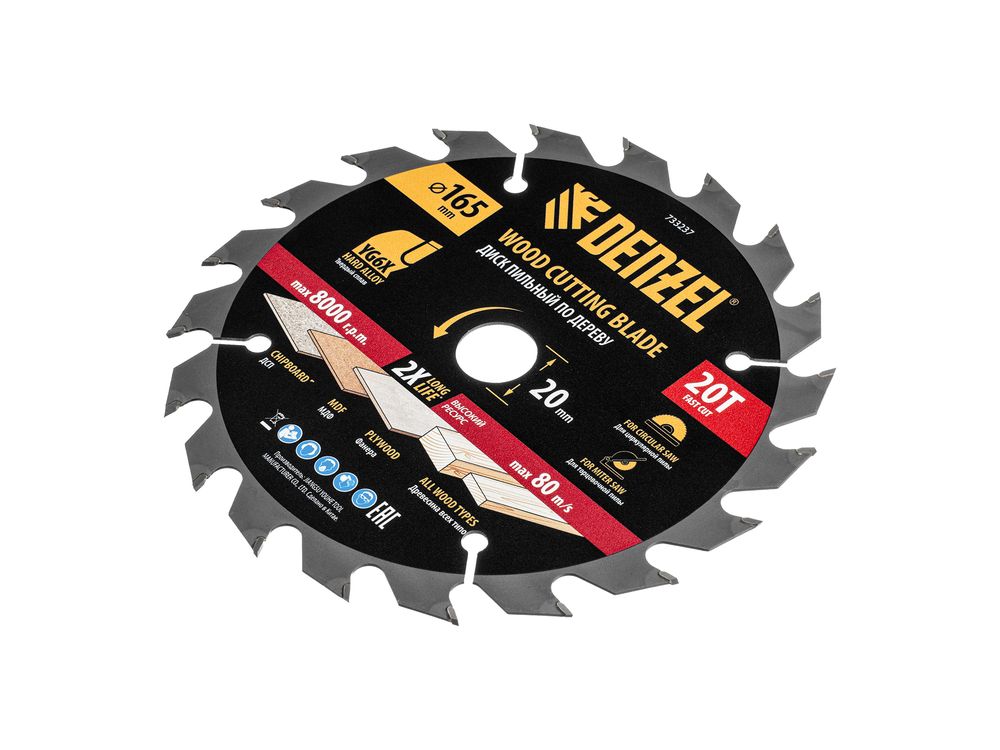 Пильный диск Denzel 733237 диаметром 165 x 20 мм, с 20 зубьями, предназначен для продольного и поперечного распила твердой и мягкой древесины, фанеры, МДФ, ДСП. 20 зубьев типа ATB с режущими пластинами оптимальной геометрии обеспечивают быстрый рез. Режущие пластины из твердого сплава YG6X сохраняют рабочие свойства при интенсивном использовании. Диск устанавливается на циркулярную, торцовочную пилу или на распиловочный станок. В комплект поставки входит переходное кольцо с 20 на 16 мм, что позволяет изменить посадочный размер и расширяет возможности использования диска.