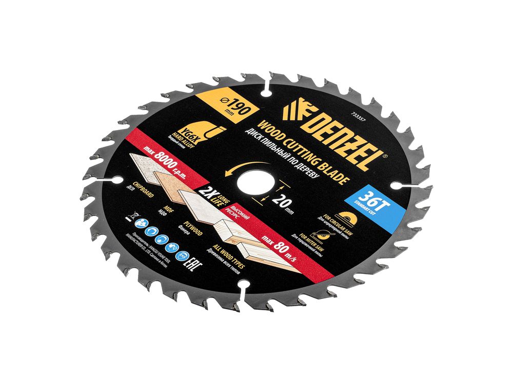Пильный диск Denzel 733357 диаметром 190 x 20 мм, с 36 зубьями, предназначен для продольного и поперечного распила твердой и мягкой древесины, фанеры, МДФ, ДСП. 36 зубьев типа ATB с режущими пластинами оптимальной геометрии обеспечивают качественный рез. Тип реза — стандартный. Режущие пластины из твердого сплава YG6X сохраняют рабочие свойства при интенсивном использовании. Диск устанавливается на циркулярную, торцовочную пилу или на распиловочный станок. В комплект поставки входит переходное кольцо с 20 на 16 мм, что позволяет изменить посадочный размер и расширяет возможности использования диска.