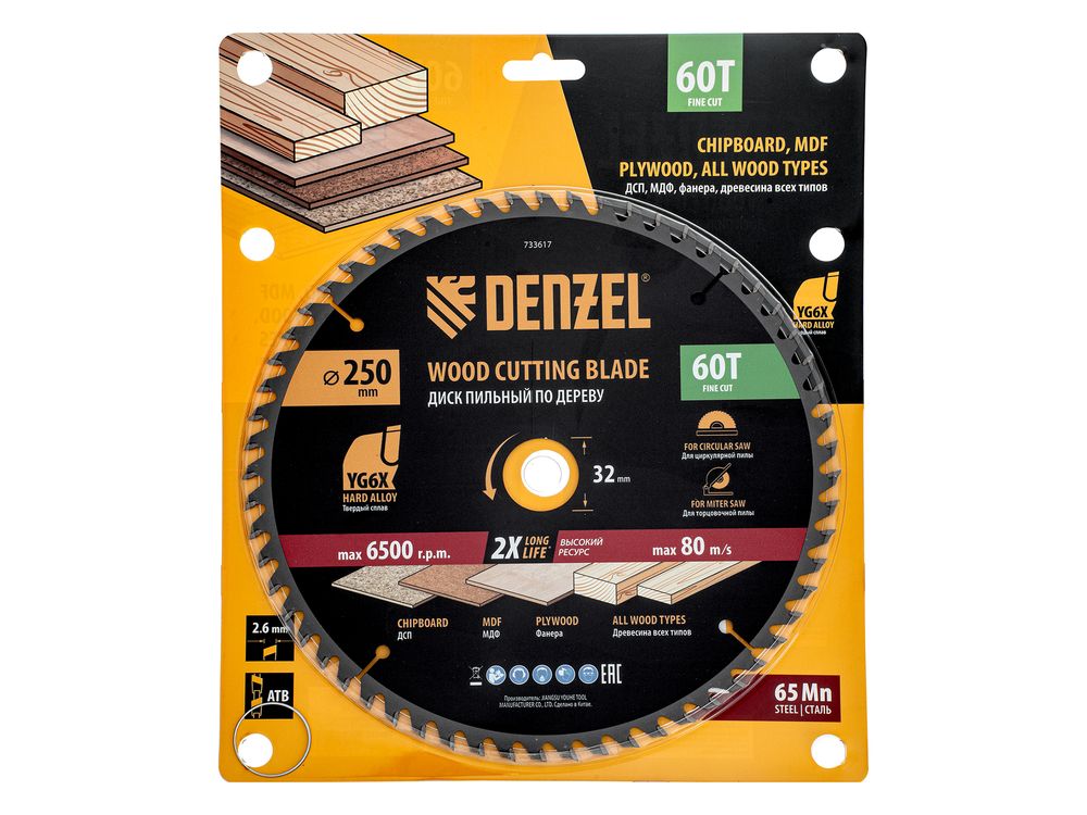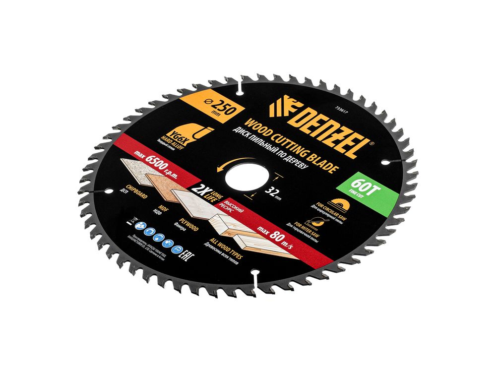 Пильный диск Denzel 733617 диаметром 250 x 32 мм, с 60 зубьями, предназначен для точного продольного и поперечного распила твердой и мягкой древесины, фанеры, МДФ, ДСП. 60 зубьев типа ATB с режущими пластинами оптимальной геометрии обеспечивают чистый рез. Режущие пластины из твердого сплава YG6X сохраняют рабочие свойства при интенсивном использовании. Диск устанавливается на циркулярную, торцовочную пилу или на распиловочный станок. В комплект поставки входит переходное кольцо с 32 на 30 мм, что позволяет изменить посадочный размер и расширяет возможности использования диска.