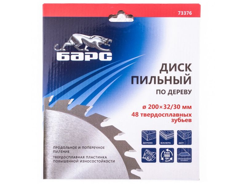 Пильный диск Барс 73376 диаметром 200 х 32 мм, с 48 зубьями и кольцом 32/30 мм, предназначен для оптимального по скорости и качеству пиления древесины мягких и твердых пород, ДСП, МДФ и фанеры. Мелкие зубья типа АТВ и оптимально подобранный угол зуба позволяют производить качественный поперечный распил. Диск используется совместно с торцовочными и циркулярными пилами с посадкой 32 мм. В комплект входит переходное кольцо на диаметр 30 мм, расширяющее возможности применения оснастки. Диск подходит для интенсивной эксплуатации и может использоваться в профессиональной сфере.