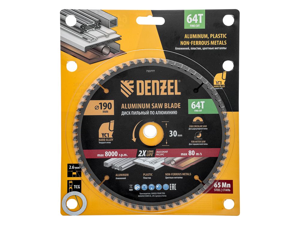 Пильный диск Denzel 733777 диаметром 190 x 30 мм, с 64 зубьями, предназначен для точного распиливания заготовок из алюминия, пластика, цветных металлов. Устанавливается на циркулярную или торцовочную пилу, также возможно использование с распиловочным станком. Зубья трапециевидно-плоского типа (TCG) с отрицательным углом заточки обеспечивают ровный рез без сколов. В комплект поставки входит переходное кольцо 30/20 мм, позволяющее изменить посадочный диаметр при необходимости.