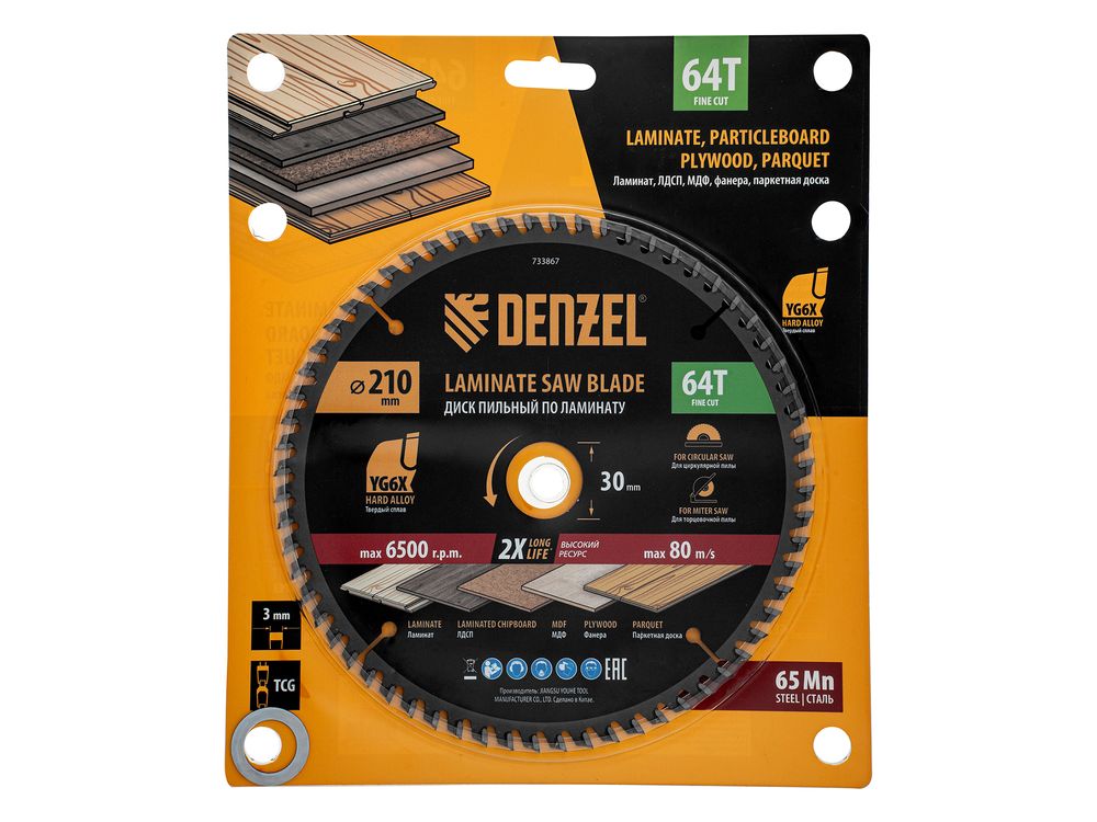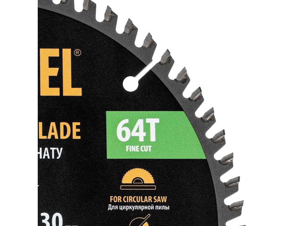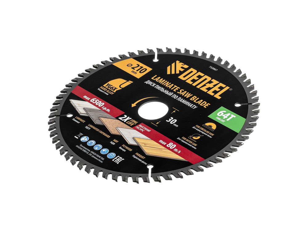 Пильный диск Denzel 733867 диаметром 210 x 30 мм, с 64 зубьями, используется для точного распиливания ламината, ЛДСП, МДФ, фанеры, паркетной доски. 64 мелких трапециевидно-плоских зубьев с положительным углом заточки позволяют эффективно решать поставленные задачи, обеспечивая чистый рез. Диск устанавливается на циркулярную или торцовочную пилу, а также на распиловочный станок. Можно установить оснастку на инструмент с другим посадочным диаметром — для этого предусмотрено переходное кольцо 30/20 мм.
