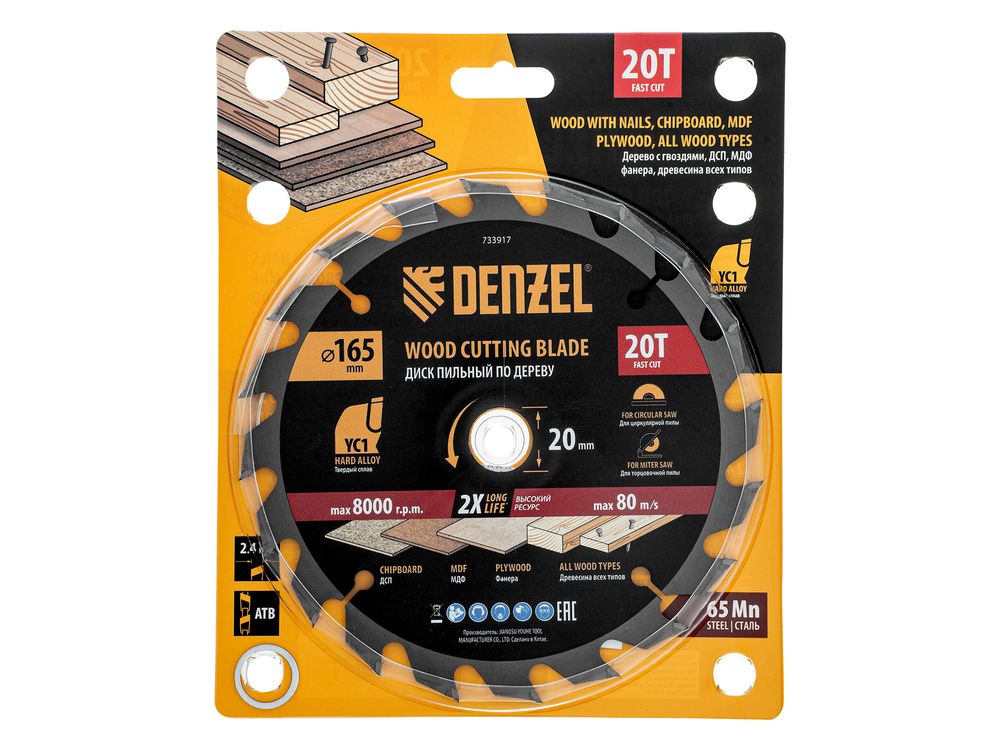 Пильный диск Denzel 733917 диаметром 165 x 20 мм, с 20 зубьями типа ATB, предназначен для быстрого продольного и поперечного распиливания древесины всех типов, в том числе с гвоздями и остатками бетона, а также ДСП, МДФ, фанеры. Режущие пластины из твердого сплава YC1, прошедшие многоступенчатую заточку, позволяют успешно справляться с прочными материалами. Диск устанавливается на циркулярную, торцовочную пилу или на распиловочный станок. В комплект поставки входит переходное кольцо 20/16 мм, позволяющее изменить посадочный диаметр при необходимости.