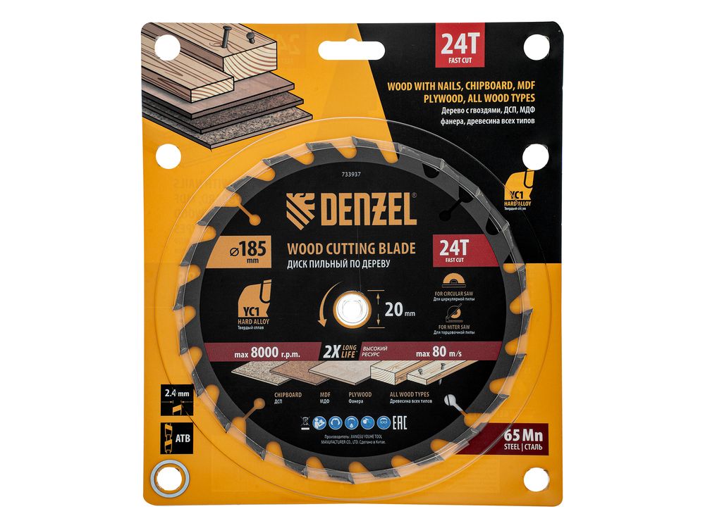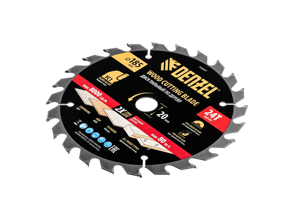 Пильный диск Denzel 733937 диаметром 185 x 20 мм, с 24 зубьями типа ATB, предназначен для быстрого продольного и поперечного распиливания древесины всех типов, в том числе с гвоздями и остатками бетона, а также ДСП, МДФ, фанеры. Режущие пластины из твердого сплава YC1, прошедшие многоступенчатую заточку, позволяют успешно справляться с прочными материалами. Диск устанавливается на циркулярную, торцовочную пилу или на распиловочный станок. В комплект поставки входит переходное кольцо 20/16 мм, позволяющее изменить посадочный диаметр при необходимости.