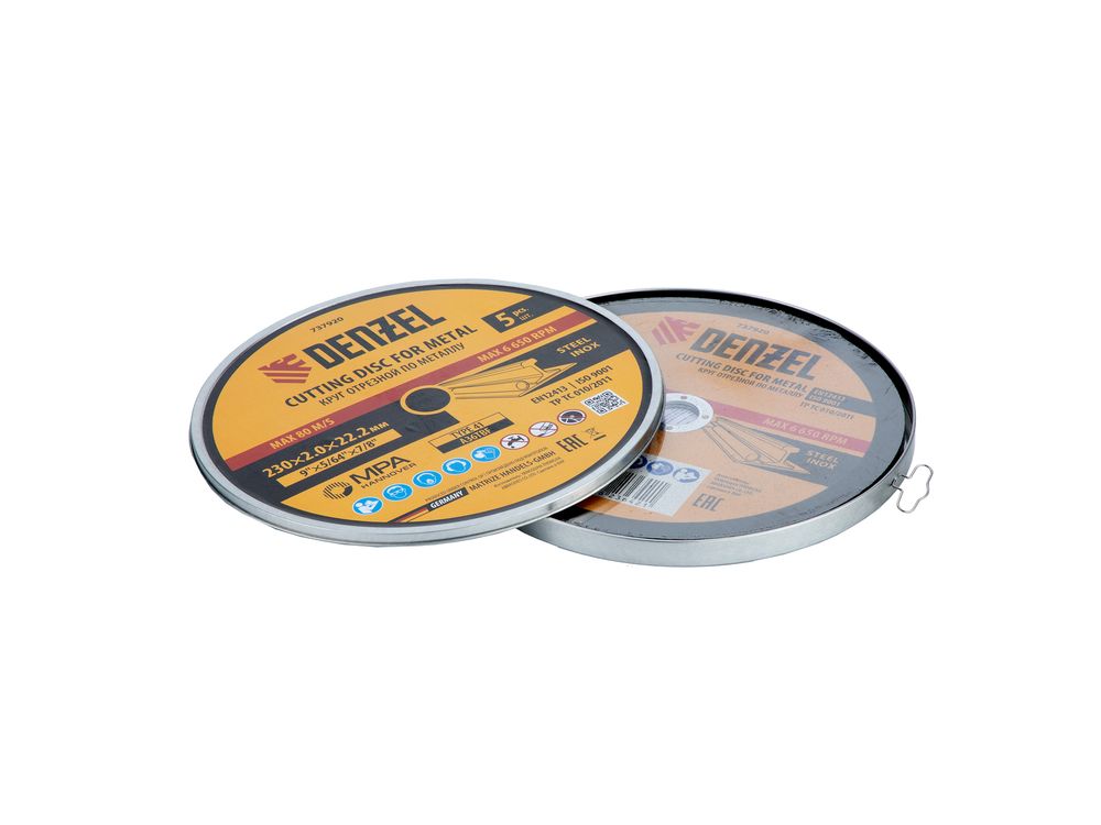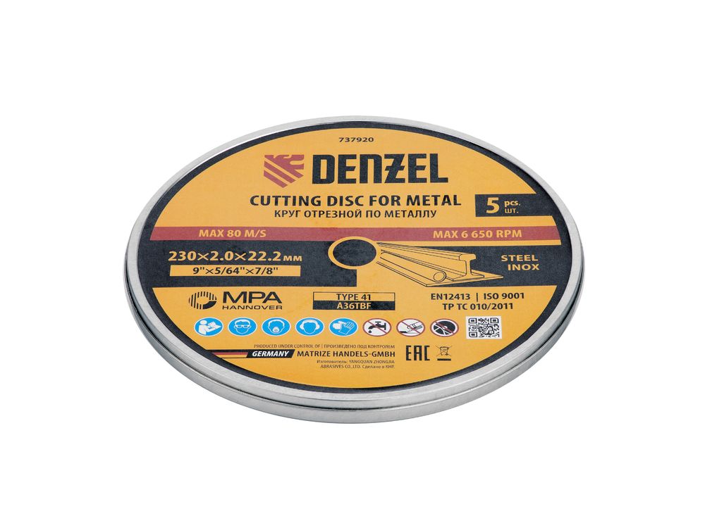 Круг отрезной по металлу Denzel 737920 (A36TBF) размером 230 х 2,0 х 22,2 мм, 5 шт. в металлической банке, устанавливается на УШМ соответствующего типоразмера. Универсальная оснастка подходит для резки нержавеющей и углеродистой стали. Набор предназначен для профессионального использования и большого объема работ.