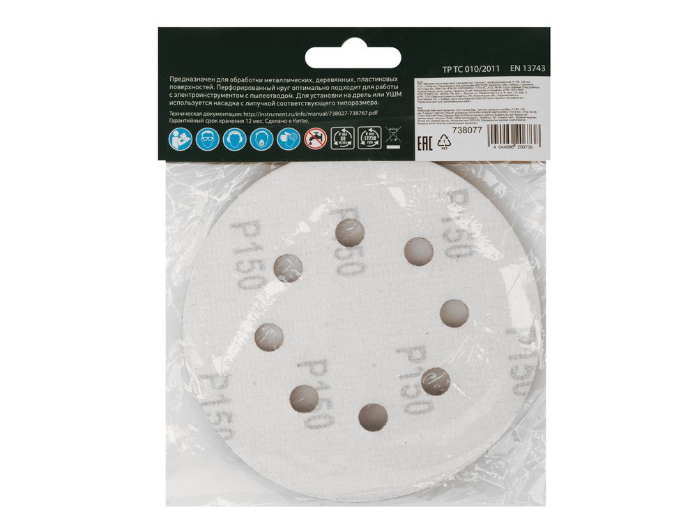 Круг абразивный на ворсовой подложке под липучку, перфорированный, P 150, 125 мм, 5 шт