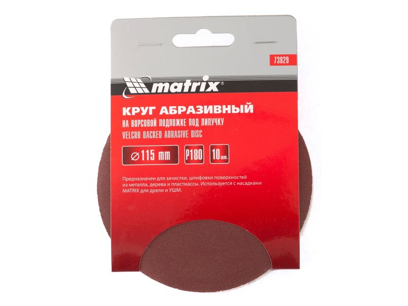 Абразивный круг на ворсовой подложке под «липучку» Matrix Р180 арт. 73829 используется для сухого чистового шлифования металла, дерева, пластика и других поверхностей. Круг устанавливается на эксцентриковые (орбитальные) шлифовальные машинки или на дрель с помощью опорной насадки Matrix.