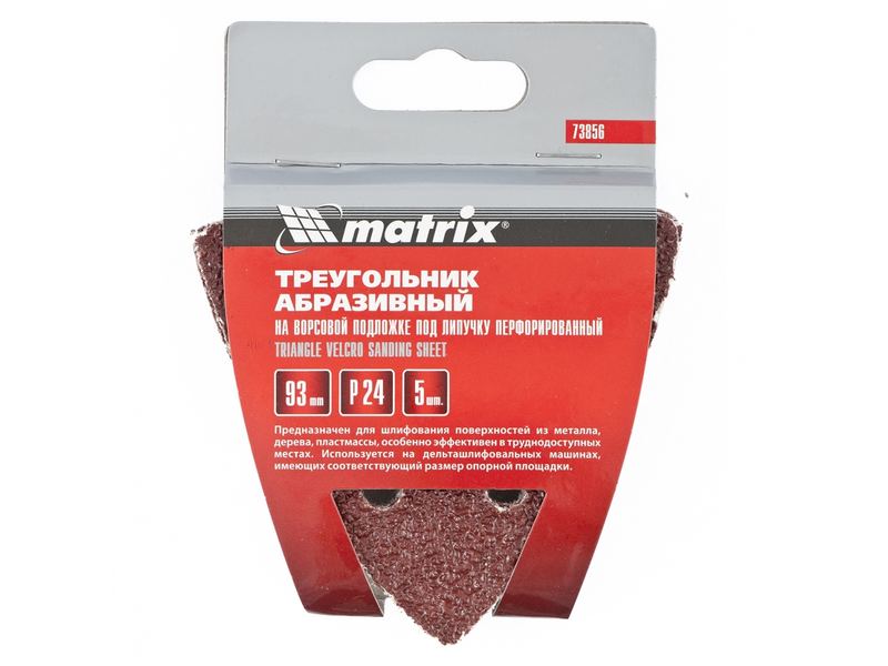 Перфорированный абразивный треугольник под «липучку» Matrix Р 24 арт. 73856 предназначен для дельташлифовальных машин с опорной площадкой 93 мм. С помощью абразива крупной зернистости Р24 можно произвести сухую черновую обработку дерева, металла, пластмассы, придать заготовкам окончательную геометрию, зачистить их от старых покрытий, ржавчины и заусенцев. Треугольная форма облегчает обработку труднодоступных мест.