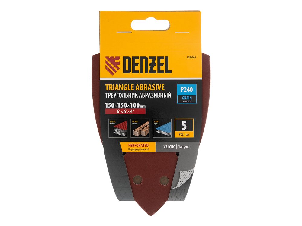 Абразивный перфорированный треугольник на ворсовой подложке «под липучку» Denzel 738667 размером 150 х 150 х 100 мм, 5 шт. в упаковке, имеет зернистость P 240 и предназначен для финишной обработки металлических, деревянных и других деталей. Позволяет устранять с поверхности мельчайшие шероховатости, удобен для работы в углах и других труднодоступных местах. Треугольник совместим с плоскошлифовальной машиной Denzel 27614, также подходит для установки на другие шлифмашины с размером рабочей платформы 150 х 150 х 100 мм.
